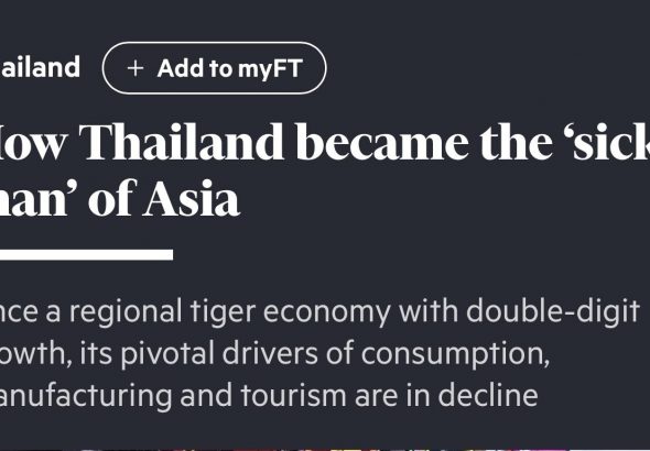 Financial Times “How Thailand became the ‘sick man’ of Asia” ประเทศไทยกลายเป็น ‘คนป่วย’ แห่งเอเชียได้อย่างไร” 3 min read ข่าวต่างประเทศ ข่าวเศรษฐกิจ Financial Times “How Thailand became the ‘sick man’ of Asia” ประเทศไทยกลายเป็น ‘คนป่วย’ แห่งเอเชียได้อย่างไร” admin2 5 กุมภาพันธ์ 2026 Financial Times &nRead More