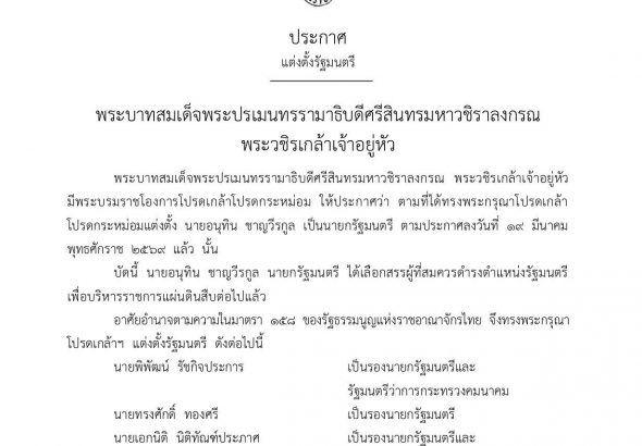 พระบรมราชโองการ ประกาศ แต่งตั้งนายอนุทิน ชาญวีรกูล นายกรัฐมนตรี คนที่ 32 สมัยที่ 2 2 min read ข่าวการเมือง พระบรมราชโองการ ประกาศ แต่งตั้งนายอนุทิน ชาญวีรกูล นายกรัฐมนตรี คนที่ 32 สมัยที่ 2 admin2 21 มีนาคม 2026 อนุทิน‘ รับสRead More