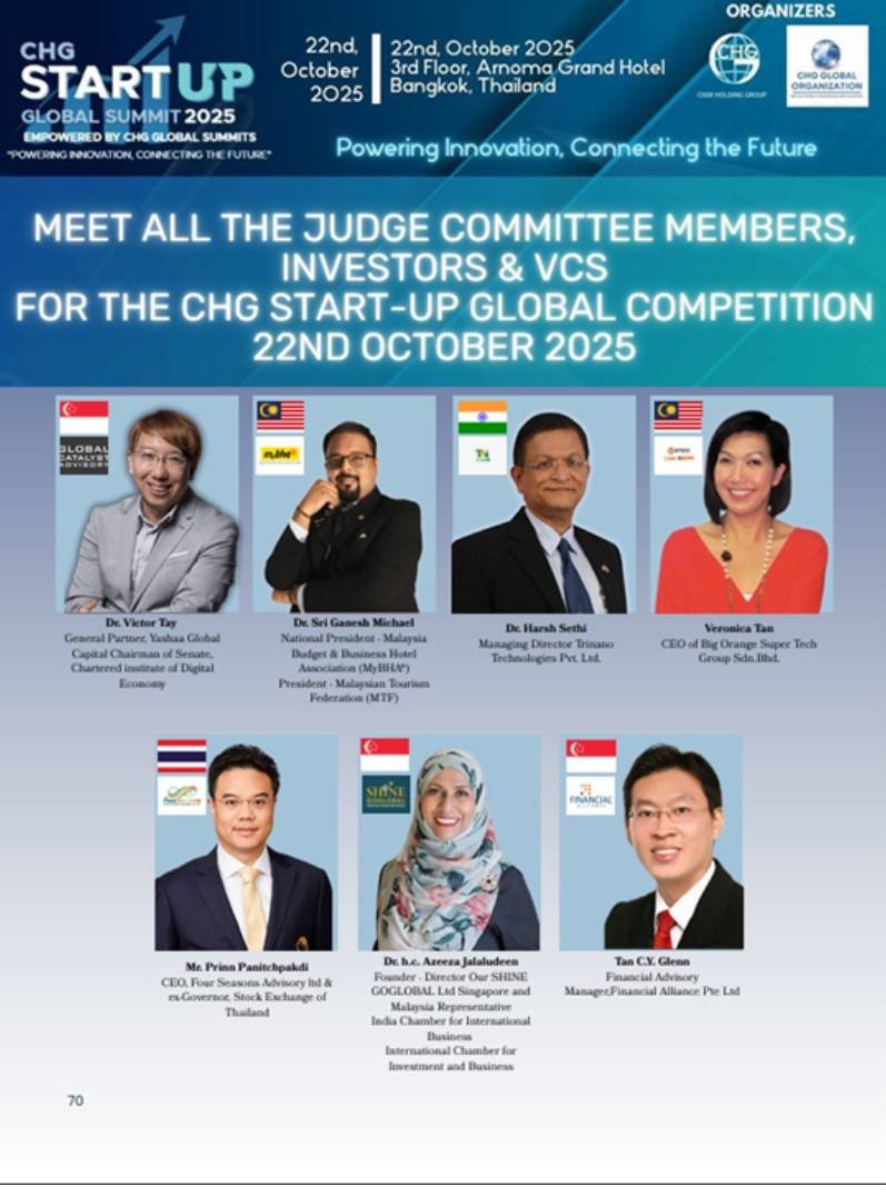 – 11 ตุลาคม 2026 – วันที่สอง CHG Start-Up Global Pitching 2026 จัดขึ้นระหว่างงาน The 2nd Global Economic Forum – Annual Meeting (Bangkok) ร่วมด้วยนักลงทุนระดับโลก, VCs, Accelerators และคณะกรรมการตัดสินนานาชาติ