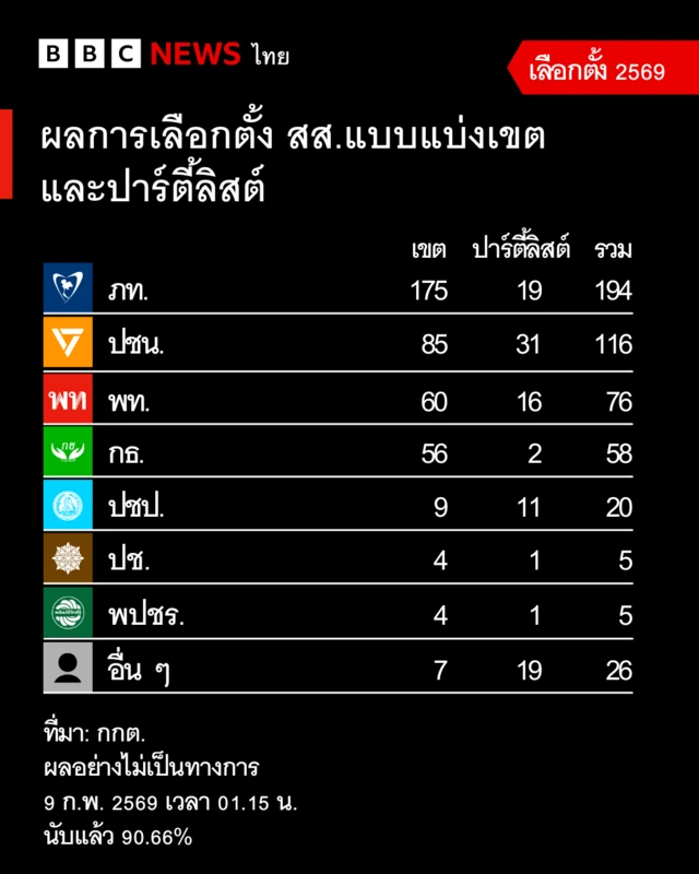 วันที่ 9 ก.พ.2569 คณะกรรมการการเลือกตั้ง (กกต.) ประกาศผลการเลือกตั้งปี 2569 อย่างไม่เป็นทางการ ข้อมูล ณ เวลา 03:57 นับเสร็จ 94 เปอร์เซ็นต์ ผ่านระบบ ECT REPORT 2569โดยพบว่า ผลไม่เป็นทางการ
