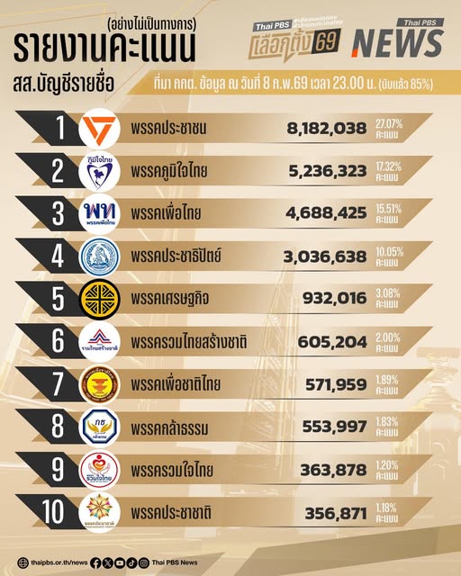 “พรรคประชาชน” แชมป์ปาร์ตี้ลิสต์ (ใกล้แตะ 10 ล้านเสียง) ในส่วนคะแนนบัญชีรายชื่อ (ปาร์ตี้ลิสต์) พรรคประชาชน ยังคงได้รับความไว้วางใจสูงสุดจากประชาชน: