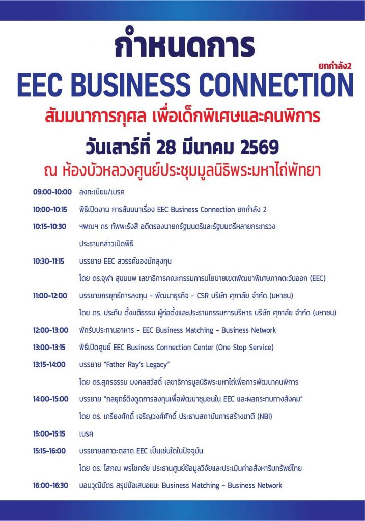 ดร.วิริยพล คณาสิริวัฒน์ ผู้ก่อตั้งและประธานเจ้าหน้าที่บริหารนิตยสารออนไลน์ 3 ภาษา ไทย จีน อังกฤษ ในนาม“TRENDS REAL ESTATE MAGAZINE” และผู้ก่อตั้งและประธาน “EEC BUSINESS CONNECTION”และที่ปรึกษามูลนิธิพระมหาไถ่เพื่อการพัฒนาคนพิการ เตรียมจัดงานสัมมนาการกุศลเพื่อเด็กพิเศษและคนพิการ ภายใต้ชื่องาน “EEC BUSINESS CONNECTION ยกกำลัง 2” ในวันเสาร์ที่ 28 มีนาคม 2569 ณ.ห้องบัวหลวง ศูนย์ประชุมมูลนิธิพระมหาไถ่ พัทยา จ.ชลบุรี โดยได้ร่วมกับมูลนิธิพระมหาไถ่เพื่อการพัฒนาคนพิการ ที่ก่อตั้งในปี พ.ศ. 2527 โดยบาทหลวงเรย์มอนด์ เบรนแนน (คุณพ่อเรย์) ที่เมืองพัทยา จ.ชลบุรี เพื่อสร้างอาชีพและยกระดับคุณภาพชีวิตคนพิการทั่วประเทศฟรี โดยไม่เก็บค่าใช้จ่าย ทั้งการศึกษาผ่านวิทยาลัยเทคโนโลยีพระมหาไถ่ พัทยา และศูนย์ฝึกอาชีพต่างๆ เพื่อให้พึ่งพาตนเองได้มาอย่างยาวนานจนเป็นที่รู้จักในปัจจุบัน รวมทั้ง กลุ่มพันธมิตรและภาคีเครือข่าย อาทิ สำนักงานคณะกรรมการนโยบายเขตเศรษฐกิจพิเศษภาคตะวันออก EEC พร้อมสุดยอดวิทยากร 5 ท่านระดับตำนานในงาน ประกอบด้วย ดร.จุฬา สุขมานพ เลขาธิการคณะกรรมการนโยบายเขตเศรษฐกิจพิเศษภาคตะวันออก EEC ซึ่งดูแลนโยบายและแผนงานการลงทุนทั้งระบบกว่า 8 แสนล้านบาท ดร.ประทีป ตั้งมติธรรม ผู้ก่อตั้งและประธานกรรมการบริหารบริษัท ศุภาลัย จำกัด (มหาชน) บริษัทชั้นแนวหน้าในตลาดอสังหาริมทรัพย์ ดร.ศุภรธรรม มงคลสวัสดิ์ เลขาธิการมูลนิธิพระมหาไถ่เพื่อการพัฒนาคนพิการ ซึ่งดูแลและช่วยเหลือเด็กพิเศษและคนพิการกว่า 10,000 คนที่ผ่านมา ศ.ดร.เกรียงศักดิ์ เจริญวงศ์ศักดิ์ ประธานสถาบันการสร้างชาติ NBI ผู้นำความคิดจาก 3 ทวีป 4 มหาวิทยาลัยโลก สมาคมเครือข่ายผู้สื่อข่าวและสื่อมวลชนนานาชาติ และ ดร.โสภณ พรโชคชัย ประธานศูนย์ข้อมูลวิจัยและประเมินค่าอสังหาริมทรัพย์ไทย และนายกสมาคมอสังหาริมทรัพย์สากล FIABCI THAI ซึ่งFIABCIก่อตั้งมา67 ปี มีสมาชิกรวม 70 ประเทศ ใน 5 ทวีปทั่วโลก